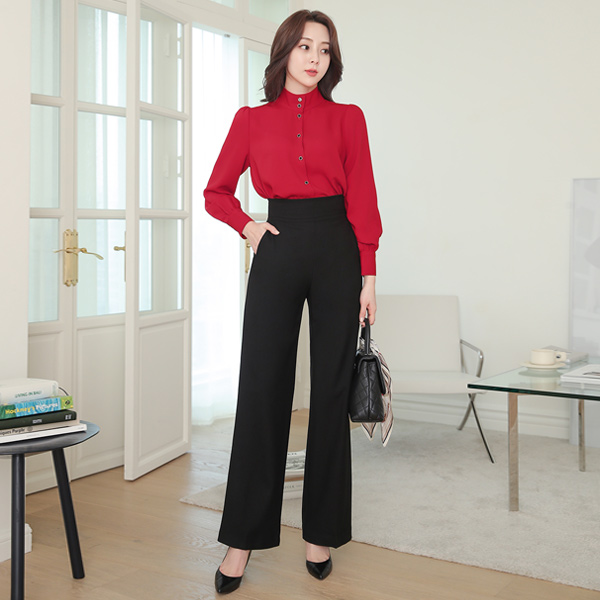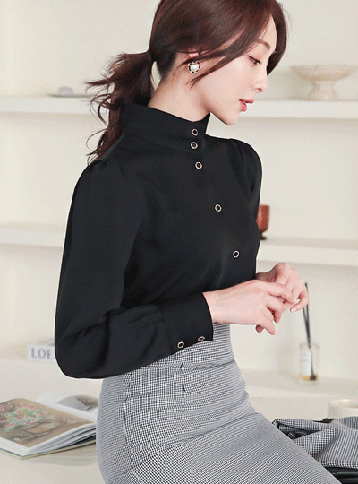 シック ゴールドライン ブラックボタン ハイネック ブラウス