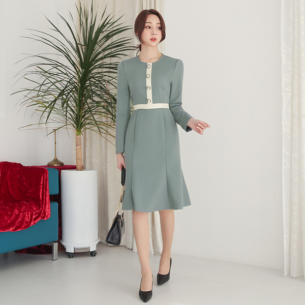 配色 テーピング 로프진주 ボタン ワンピース