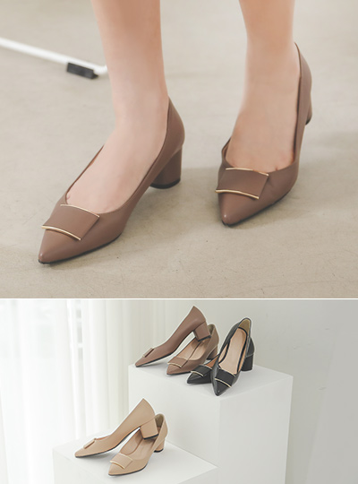 スクエア ゴールドライン ラウンド ブロックヒール パンプスヒール