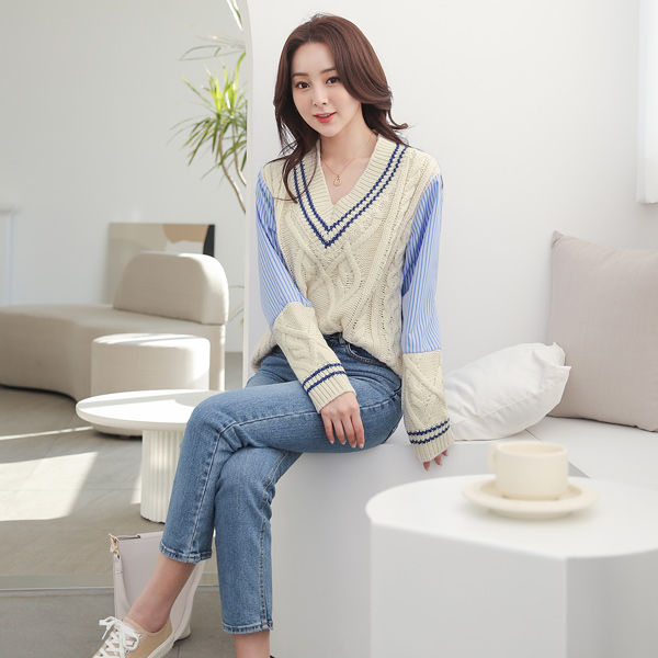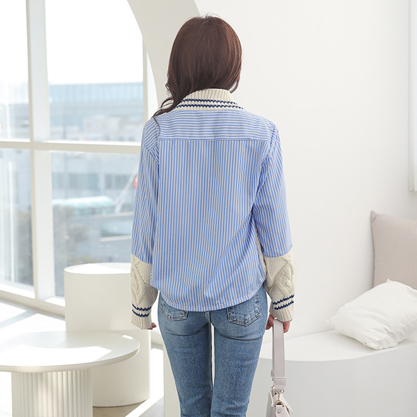 ケーブル ニット レイヤード ストライプ シャツ