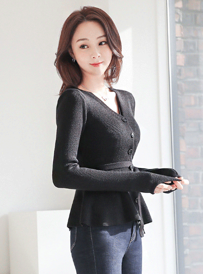 メタリック グリッターニット ベルティード ブイネック フレア カーディガン