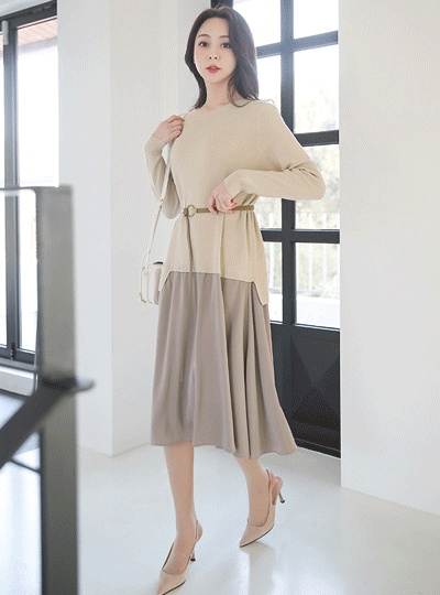 着心地のいい アンバランス ニット レイヤード サテン ロングワンピース