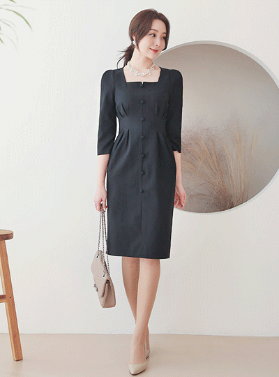 スクエア スリットネック 豆ボタン ピンタック ワンピース