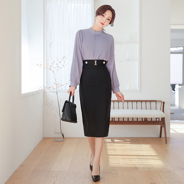 ハイネック チェーン装飾の 二重 スリーブ ブラウス