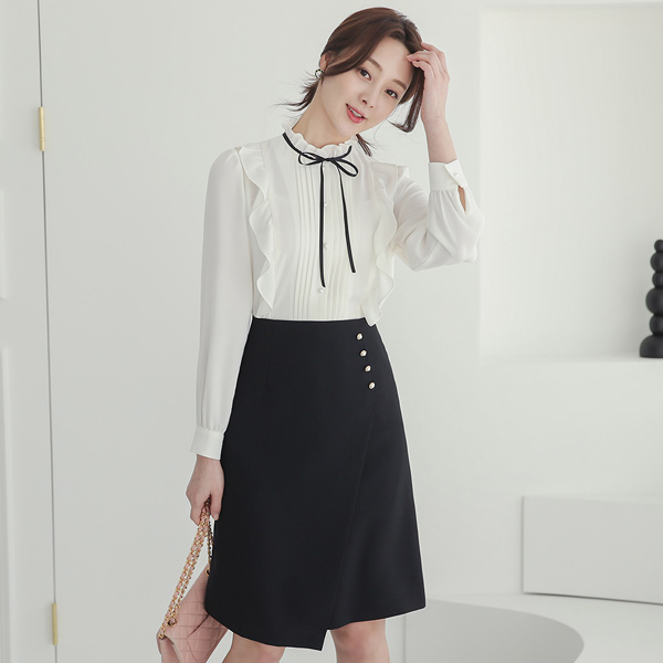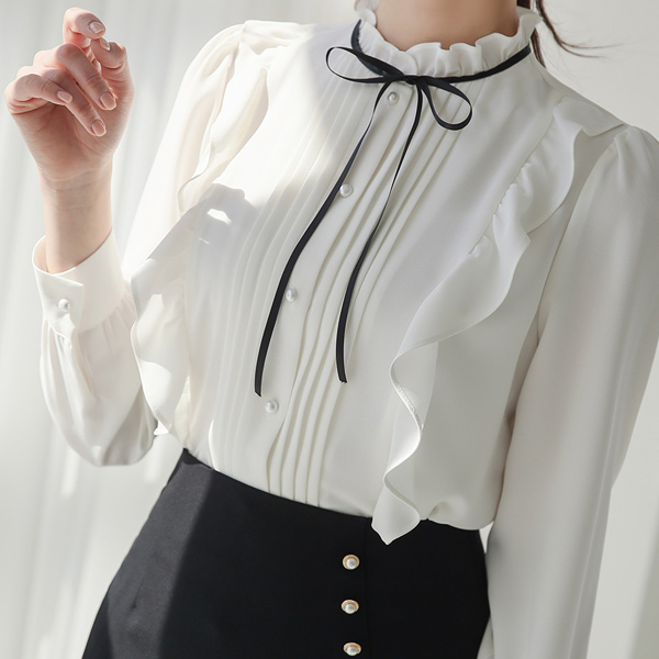 プリーツ ピンタック リボン プリルネック ブラウス