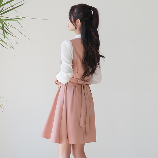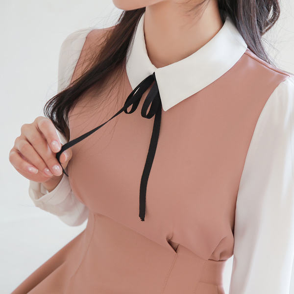 リボンタイ カラー 配色 ピンタック フレア ワンピース