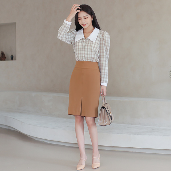 プラッド チェック ワイド フラットカラー ブラウス