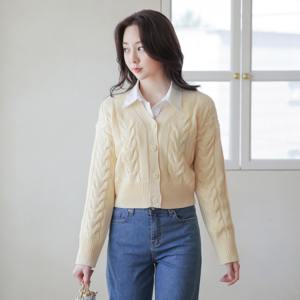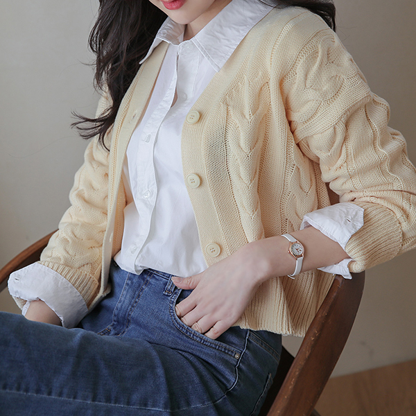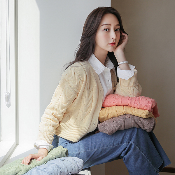 春季 パステル ケーブル ブイネック クロップド カーディガン