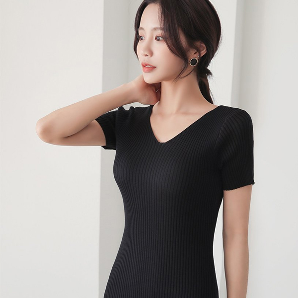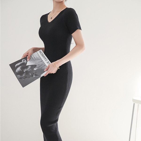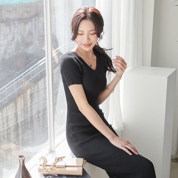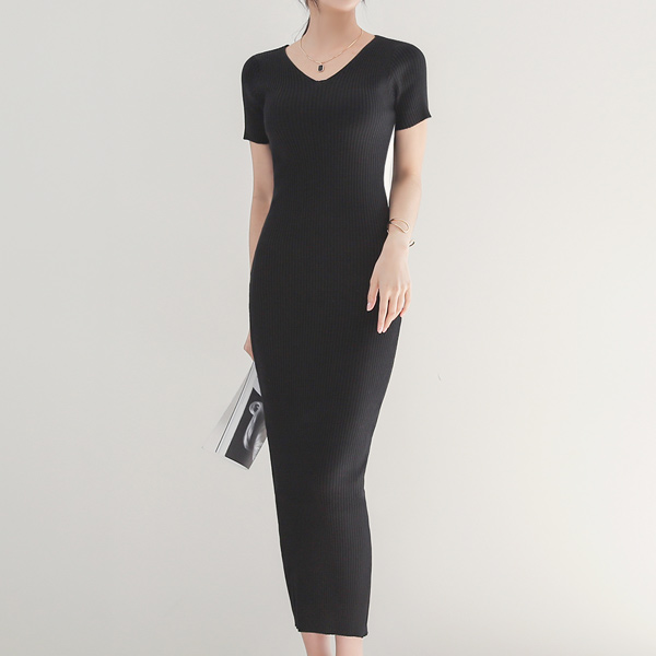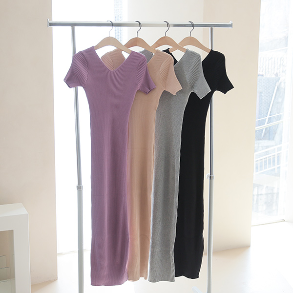 Vネック スリム コール天 ロング ニットワンピース