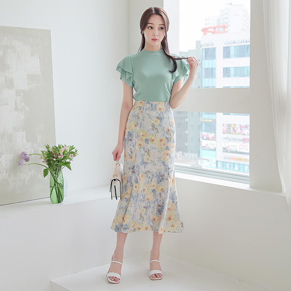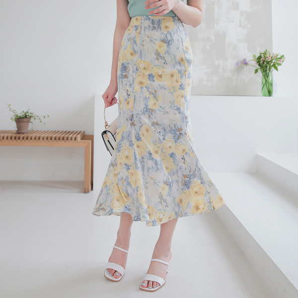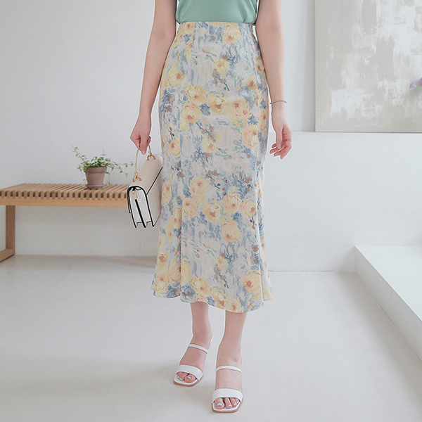 水彩画 マーブル 花柄 後面バンド マーメイド スカート