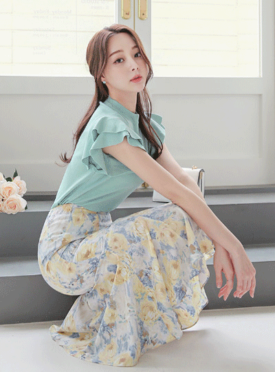 水彩画 マーブル 花柄 後面バンド マーメイド スカート