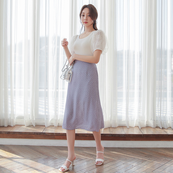ウエーブ レイス パフ袖 ニットティーシャツ