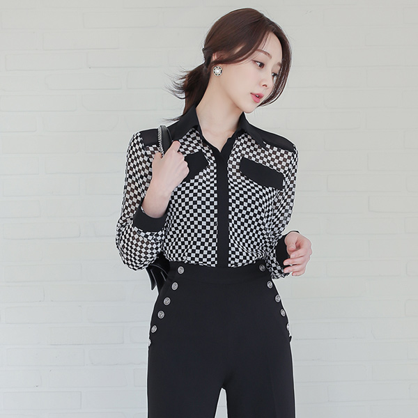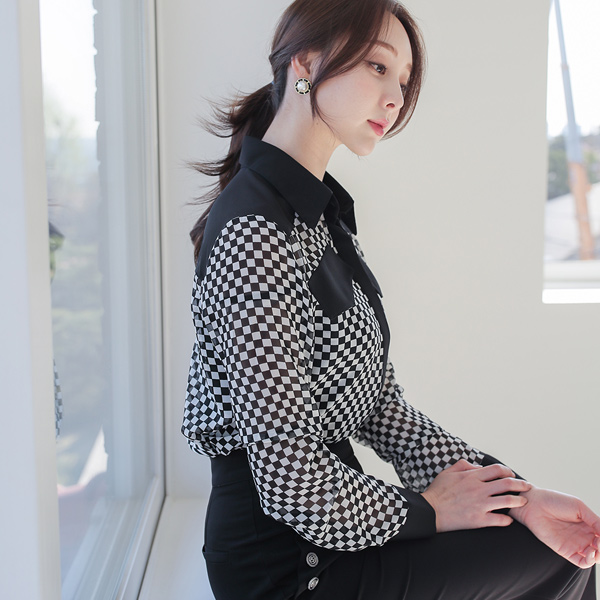 チェス ポケット 配色 シースルー シフォン ブラウス