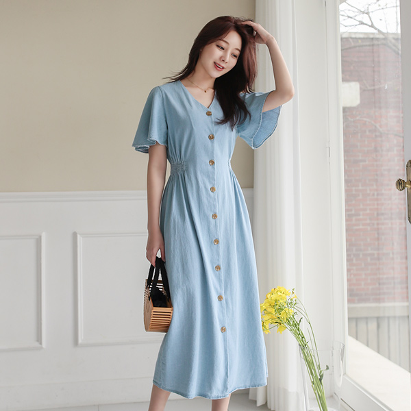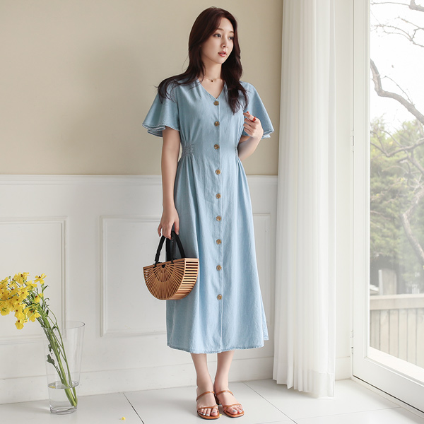 パピヨンスリープ スモック バンディング デニム ボタン ワンピース