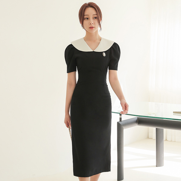 クラシック セーラーカラー 配色 スリム ロングワンピース