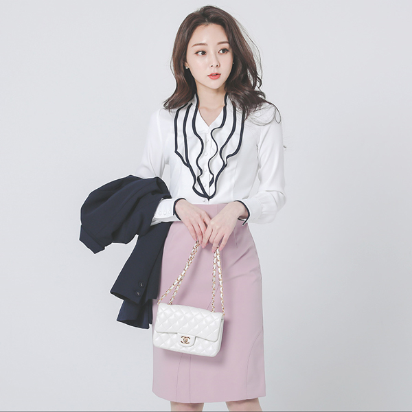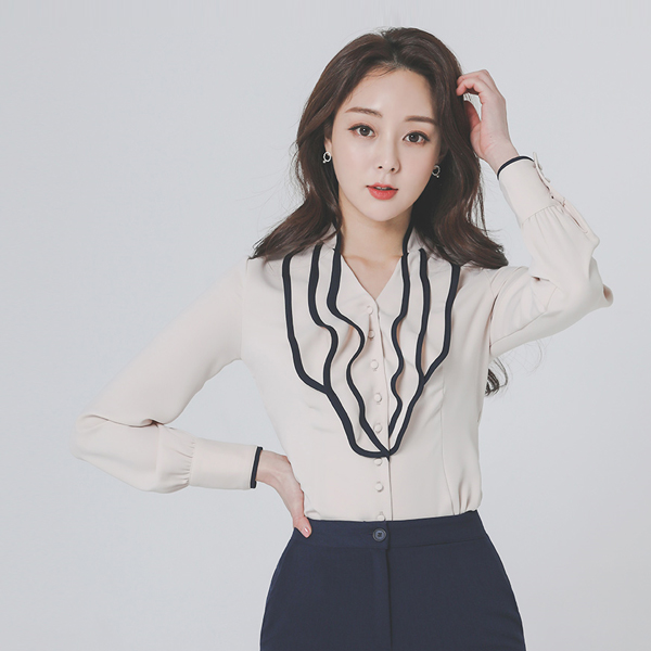 [スクラッチ商品]ロマンチック ラッフル ブイネック パイピング ブラウス