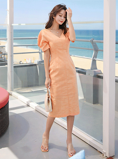 Vネック ピンタック袖 弾力 ワンピース