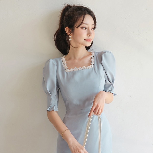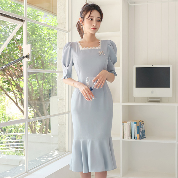 オブジェ レイス トリミング スクエアネック ラッフルライン ワンピース