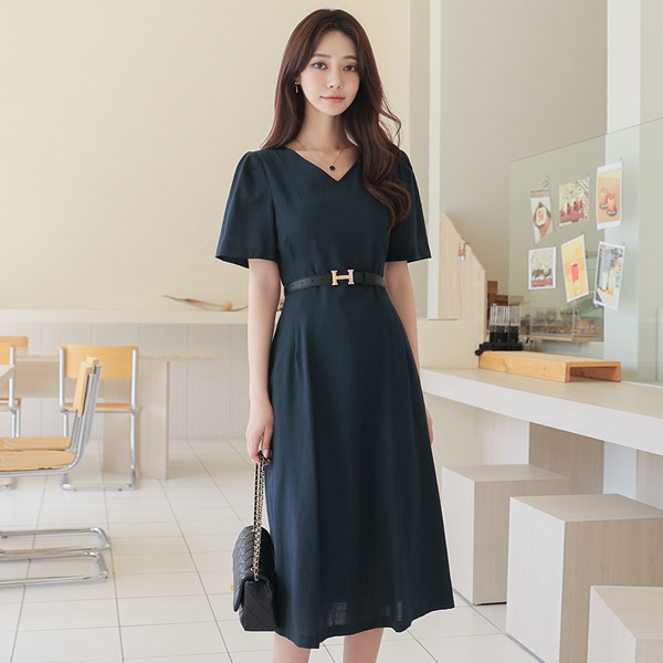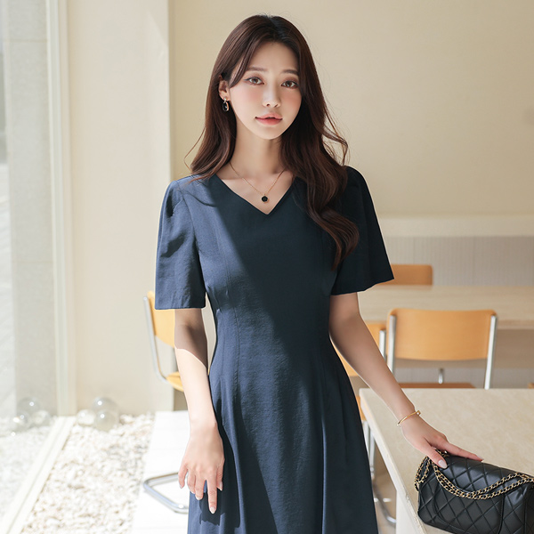 ポッシュ ブイネック ピンタック フレア ワンピース