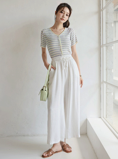 サマー クーリング ストライプ ボタン ブイネック ニット