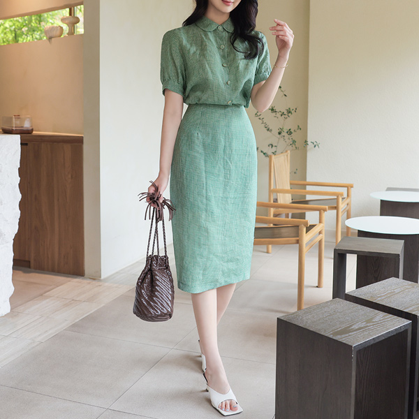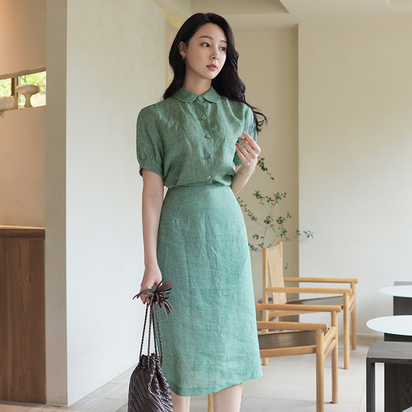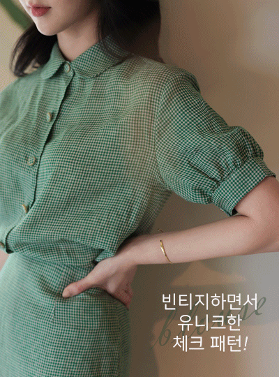 リネン 原糸ミックス チェック フラットカラー パフ ブラウス