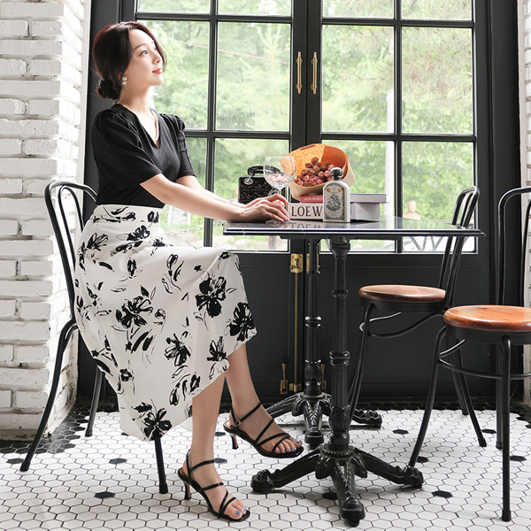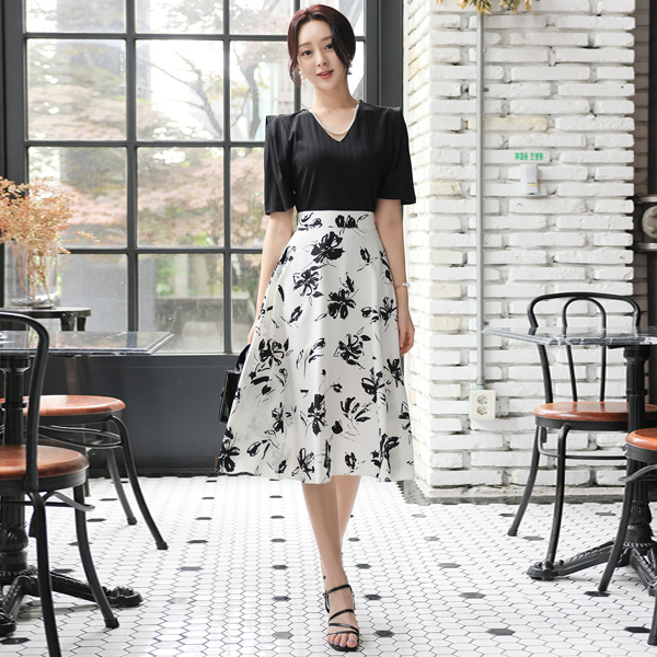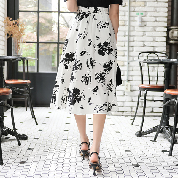 インク 花柄 シルキー 後面バンド フレア スカート