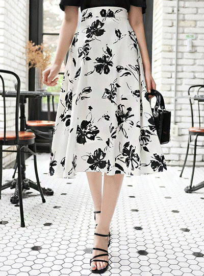 インク 花柄 シルキー 後面バンド フレア スカート