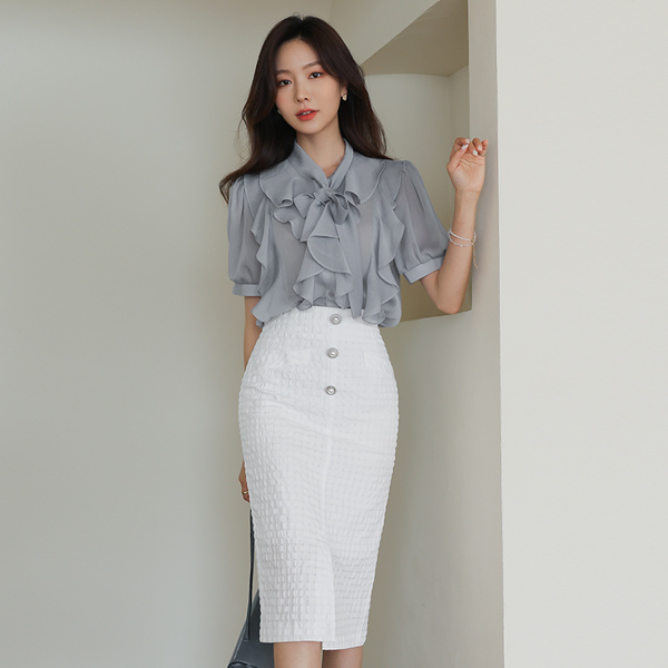 ダブル ラッフル シースルー タイ ブラウス