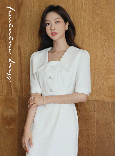 ロマンチック 真珠 ボタン White カラー ワンピース