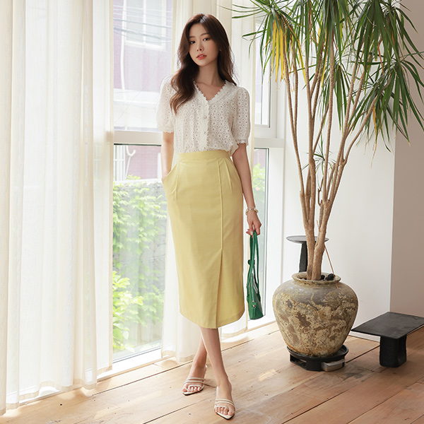ソフト 袖 ブイネック 真珠ボタン ブラウス
