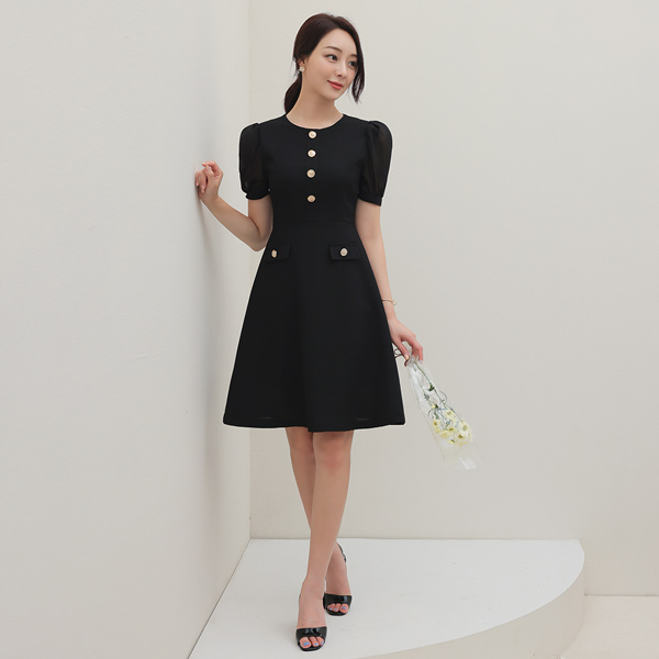 シースルー パフ袖 ツイード フレア ワンピース