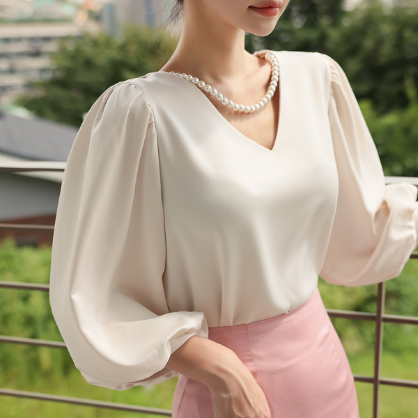 真珠 ネックレス パフ 袖 シルキー ブラウス