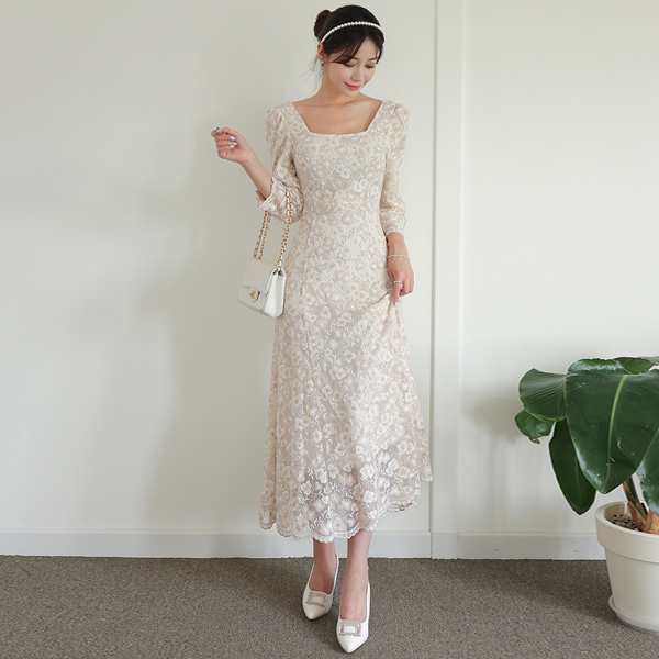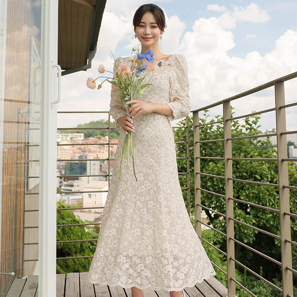 スクエアネック ゴールド 刺繍 マーメイド ウェディング ワンピース
