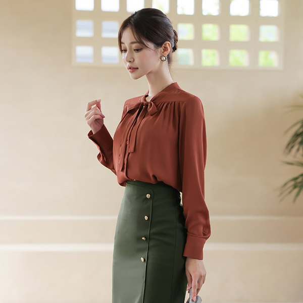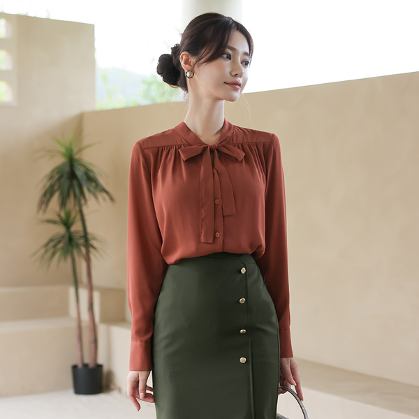 Brick ギャザーシャーリング 切開ネック リボンタイ ブラウス