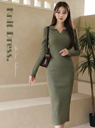 秋 オープンカラー ボールド コール天 ロング ニットワンピース