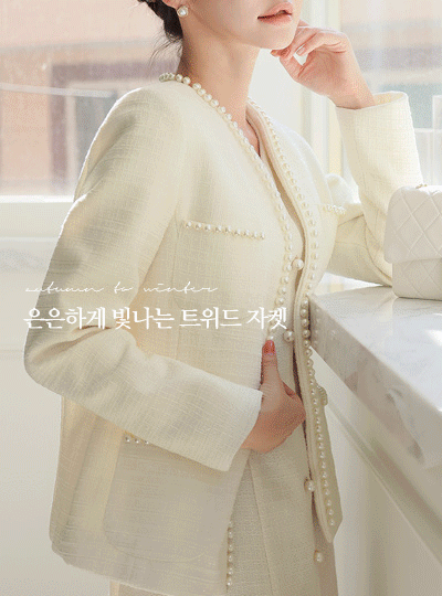 ELLE 真珠 トリミング ポケット ツイード ジャケット
