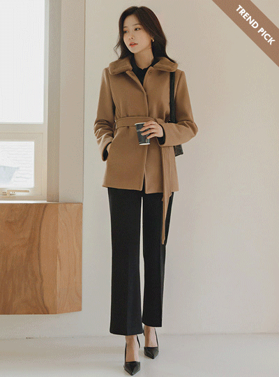 ラグジュアリー フェイクファー カラー ベルティード ハーフ ウール コート
