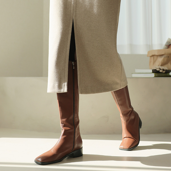 トレンディー スクエアトー レザー ロングブーツ