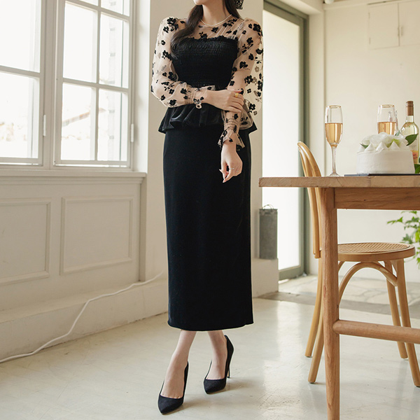 ロマンチック ベルベット 花柄 スモック シースルー ブラウス
