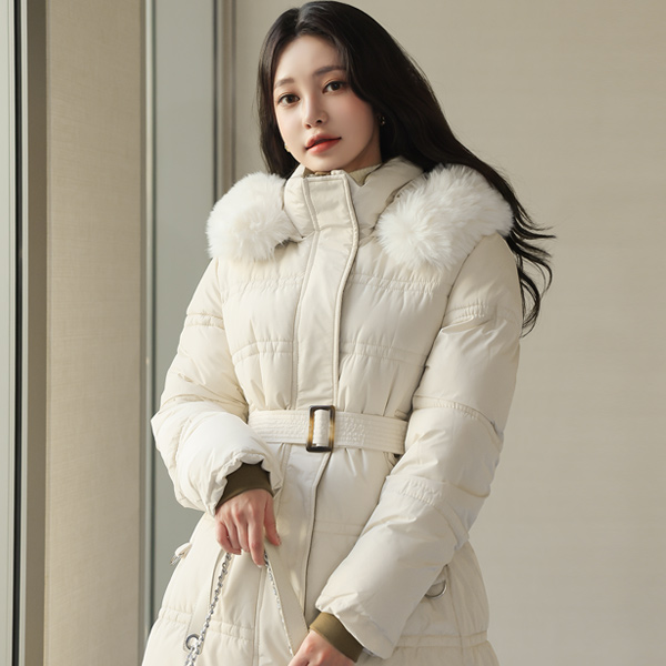 配色 ポイント エコファー フード  キルティング ロングなダウンコート