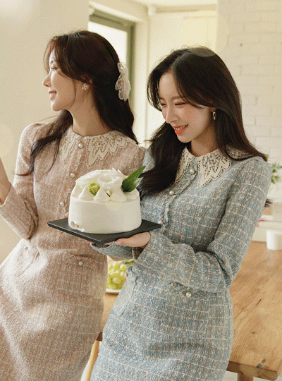 ラブリー レイス カラー パール ツイード ワンピース