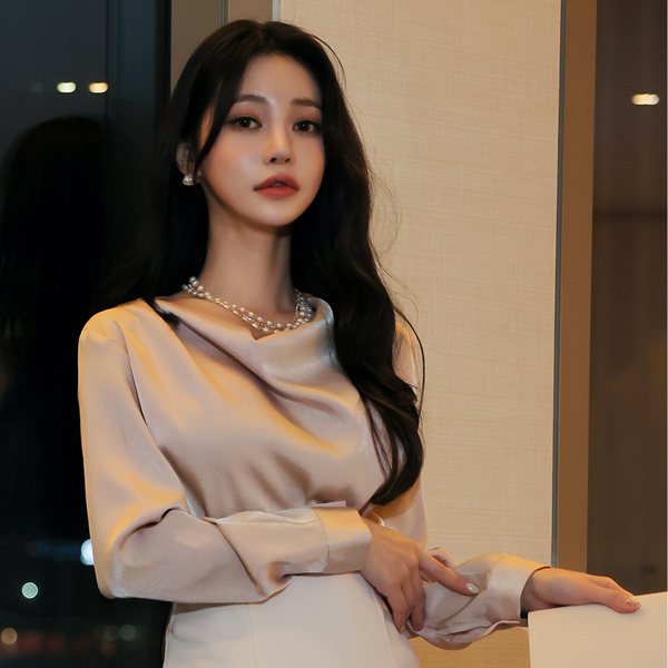 繻子 カウルネック ピンタック シャーリング ブラウス