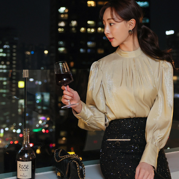 サテン グロッシー ハイネック ブラウス