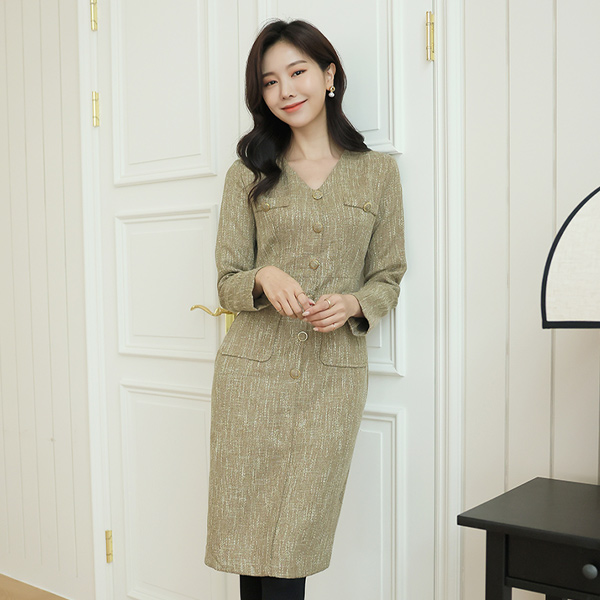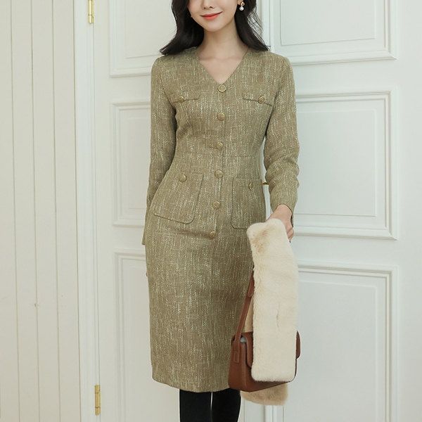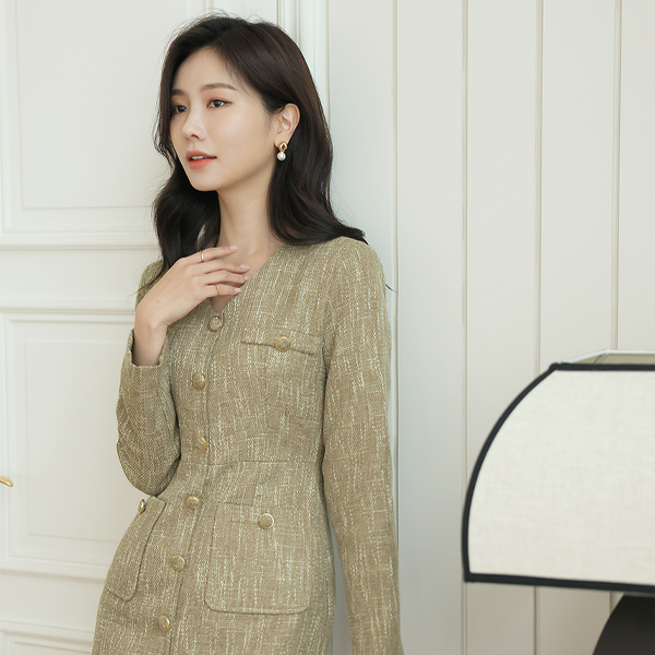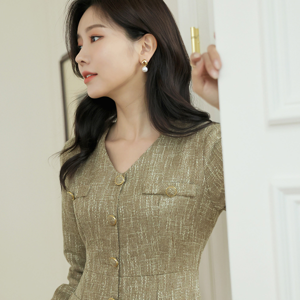 ODE ゴールドボタン ブイネック ツイード ワンピース