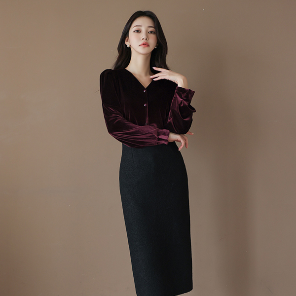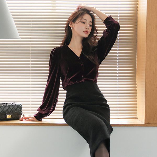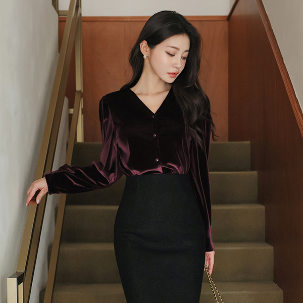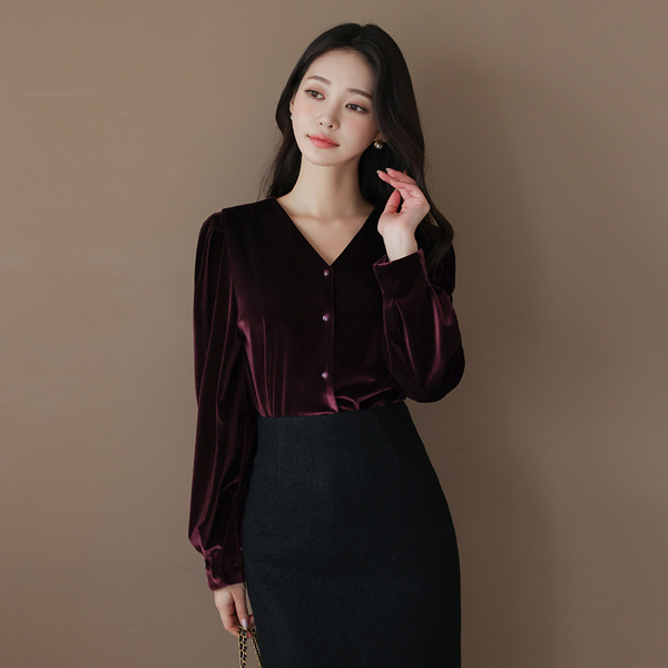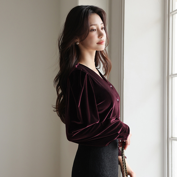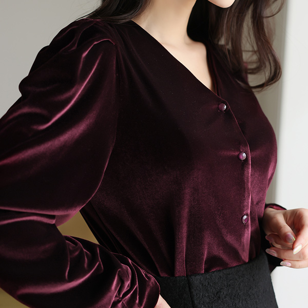 ベルベット シャーリング パフ袖 ブイネック ブラウス