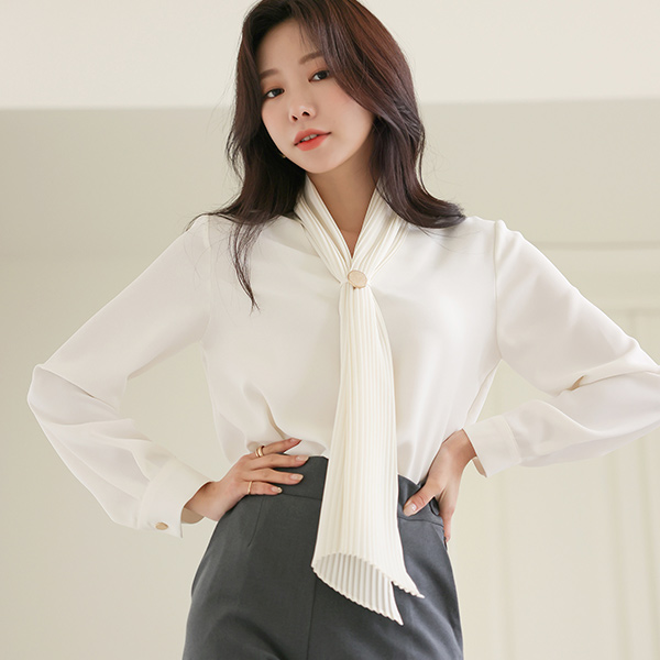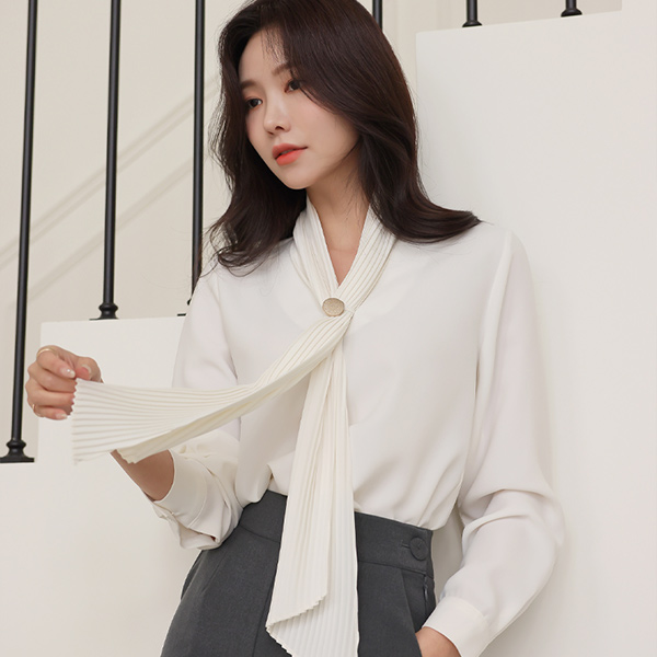 ラグジュアリー プリーツ スカーフネック ブローチ ブラウス