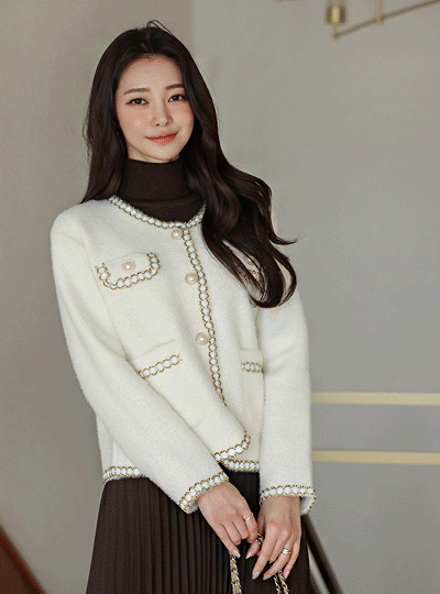 ふわふわ ライン トリミング 真珠 カーディガン