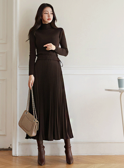 タートルネック ウール ニット レイヤード プリーツ ワンピース