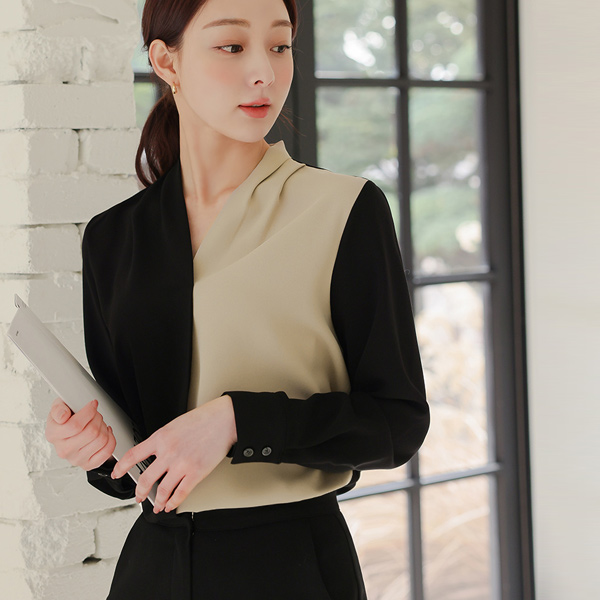 ハーフ 配色 ピンタック シャーリング ブラウス
