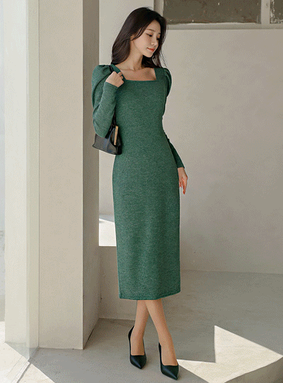 スクエアネック パフ ロング ニット ワンピース